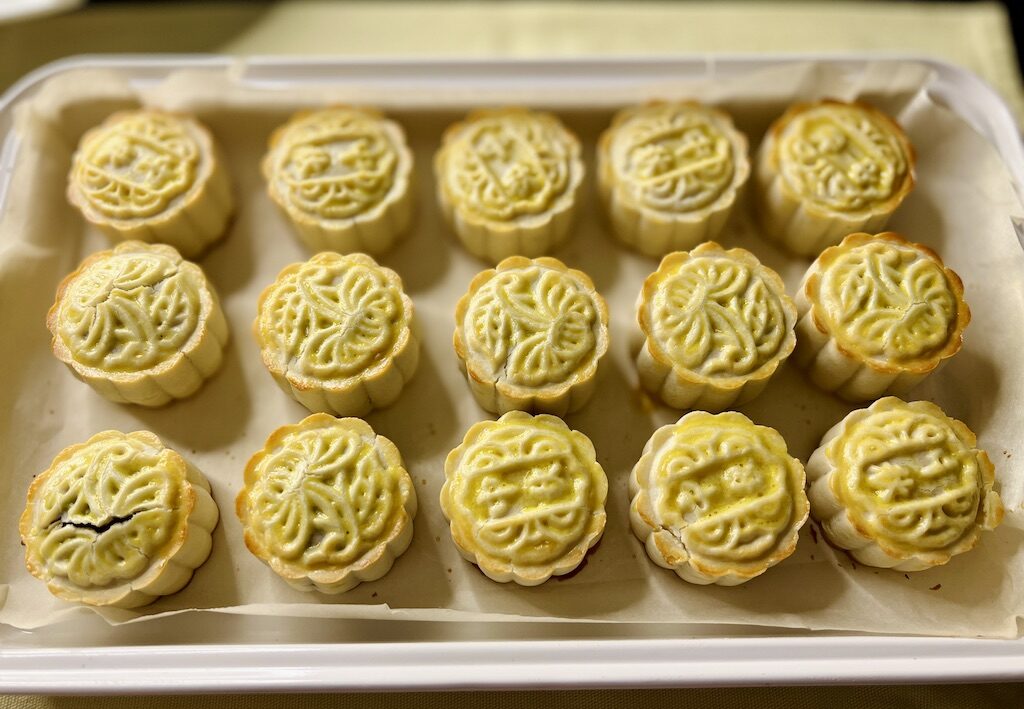 - Mooncakes are easily burn, keep an eye on it when it reaches 15 mins. Some ovens are little bit warmer. I use middle rack for backing. Once the bottom of the mooncake are turning golden, it is ready to be taken out.